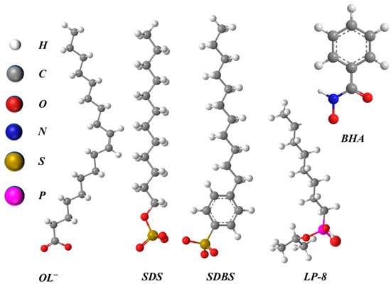 Structural formulas of oleate ion (OL−), sodium dodecyl sulfate (SDS), sodium dodecyl benzenesulfonate (SDBS), isopropyl octylphosphonic acid (LP-8), and benzohydroxamic acid (BHA).