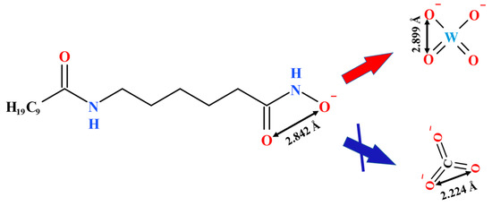 Zhao et al. conducted DFT analyses of cyclohexyl hydroxamic acid (CHA) and benzohydroxamic acid (BHA), which revealed that CHA has a higher HOMO energy, larger dipole moment, and more Mullikan or natural charges than BHA. Therefore, CHA exhibits a stronger collecting ability than BHA, which was confirmed by scheelite flotation, zeta potential, and adsorption experiments [50]. Deng et al. suggested that in addition to chelating Ca on the surface of scheelite, the hydroxamic group may also chelate with W to form a stable five-membered ring. The distance (2.842 Å) between the two oxygen atoms in hydroxamic acid matches better with the distance (2.899 Å) of the two oxygen atoms in WO42− on the surface of scheelite than the distance (2.224 Å) between the two oxygen atoms in CO32− on calcite, as shown in Figure 9 [52]. Oxide minerals and reagents with similar O-O distances are easily capable of forming stable -O-metal and =O-metal bonds [14], which may explain why hydroxamic acid selectively separates scheelite from calcite. Gao et al. used this distance matching mechanism to explain the different adsorption strengths of octyl hydroxamic acid HXMA-8 on the surfaces of scheelite and calcite [53].
