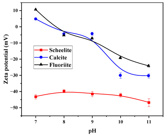 Zeta potential of scheelite, calcite, and fluorite.