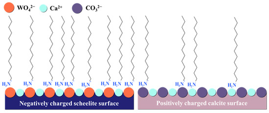 DDA is a commonly used cationic collector in the flotation of scheelite. Cationic collectors, such as DDA, need to be acidified before use to increase their solubility. Hiçyìlmaz et al.’s research demonstrated that cationic collectors to flotation scheelite and calcite exhibited similar floatability. Among the various amines, only DDA with acetate group shows certain selectivity [72]. Gao et al. investigated the adsorption behavior of DDA on the surfaces of scheelite and calcite and found that a small fraction of the RNH2 components in DDA interacted in solution with the mineral surface via Ca-N bonding and hydrogen bonding, while a larger fraction of the RNH3+ components interacted with the surface through electrostatic attraction and hydrogen bonding. Due to the more negative surface charge of scheelite, it was able to adsorb more DDA, resulting in a significant increase in the mineral surface potential [73] (Figure 12).