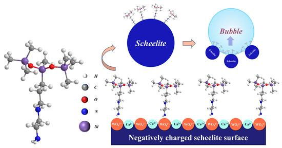 Recently, Huang et al. reported the new claw-shaped silane-based diamine collector N-(2-aminoethyl)-3-aminopropyltrimethoxysilane (AATS) and applied it to flotation separation of scheelite and calcite. The structure and possible adsorption mechanism are shown in Figure 14. In single-mineral flotation experiments, the flotation recovery rate for scheelite reached 96%, while that for calcite was only 5.5%. In binary mixed mineral experiments using AATS for flotation of a mixed mineral with a WO3 grade of 38.65%, the concentrate grade and recovery of WO3 were significantly higher than those of sodium oleate flotation; they reached 64.63% and 87.47%, respectively, compared to 35.20% and 79.34% for sodium oleate [83]. The authors studied the mechanism for adsorption of AATS on the mineral surface. The cationic collector mainly interacted with the negatively charged scheelite surface through electrostatic interactions and showed less adsorption on the positively charged calcite surface, which provided the selective separation of scheelite and calcite [83]. This collector also exhibited good separation performance in the flotation of wolframite and calcite [84].