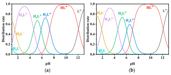 Distribution curves for the ATMP ions formed at different pHs ((a) T = 25 °C, (b) T = 35 °C).