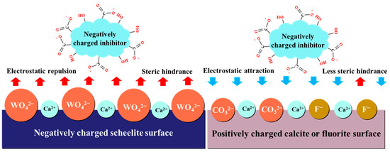 Wang et al. used sodium tripolyphosphate (ST, Na5P3O10) as the inhibitor and FX-6 sodium oleate as the collector to float and separate scheelite and calcite. In industrial experiments comparing the use of ST with that of water glass as the inhibitor, the WO3 grade of the scheelite concentrate increased from 1.42% to 1.88% when ST was used as the inhibitor, the recovery rate of scheelite was basically unaffected, and the recovery rate of calcite decreased by 20% [113]. The authors proposed a collecting mechanism of ST and FX-8, which involved preadsorption of ST on the surface of calcite, which made it difficult for more FX-8 to adsorb, thereby achieving selective separation of the scheelite and calcite [113].