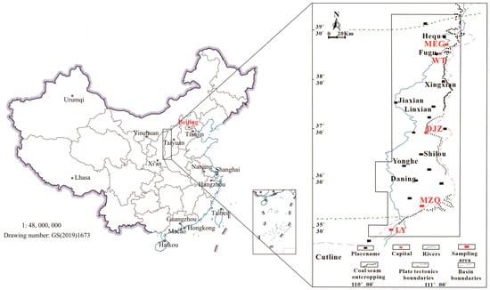 Figure 1 shows the sample collection locations, and the five types of coal samples used in this study (namely, MEG, WT, DJZ, MZQ, and LY coals) were obtained from the eastern margin of the Ordos Basin. The Ordos Basin is located in the central and western parts of the Chinese mainland. It is a cratonic hydrocarbon-bearing basin, with the characteristics of stable subsidence, depression, and migration. The main coal seams in the basin include the Upper Carboniferous Taiyuan Formation and the Lower Permian Shanxi Formation. The distribution of coal seams is stable, and the vertical coal seam development horizon is large. The coal seam is characterized by being thin in the south and thick in the north. The thickness of the coal seam in the northern region is large and changes rapidly, and that in the middle is relatively stable, while the thickness in the southern region is small and changes evenly [34]. Coal seam Nos. 4 and 5 of the Shanxi Group and Nos. 8 and 9 of the Taiyuan Group are, in particular, widely distributed in the eastern margin and exhibit stable development.