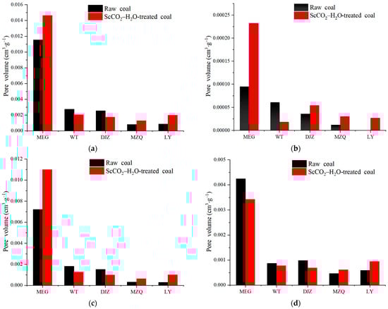 The pore volume statistics of the coal before and after the ScCO2–H2O treatment are presented in Table 5, and Figure 3 shows histograms of the pore volume distributions of the coal. Table 5 summarizes that the sum of the proportions of mesopores as well as macropores is more than 95%, indicating that the pore volume is mainly provided by mesopores and macropores. The pore volume distribution of the coals after the ScCO2–H2O treatment was complex, among which the total pore volume of the MEG, LY, and MZQ coals increased, while that of the WT and DJZ samples decreased (Figure 3a). The micropore volume of all the coal samples increased, except for that of the WT coals (Figure 3b). The mesopore volume increased in the MEG, MZQ, and LY coals and decreased in the WT and DJZ coals (Figure 3c). The macropore volume decreased in the MEG, WT, and DJZ coals and increased in the MZQ and LY coals (Figure 3d).