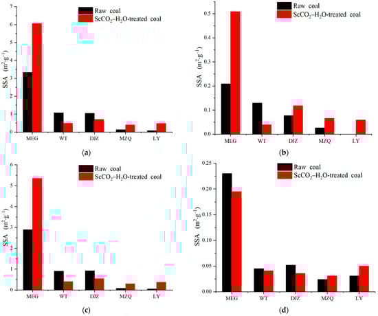 The pore SSA results of the different types of coal samples are presented in Table 6, and Figure 4 shows histograms of the distributions of the pore SSAs of the coal samples. Table 6 shows that the pore SSAs of both the raw coals and ScCO2–H2O-treated coals are concentrated in the mesopore section, accounting for 61.22% to 88.38%. The pore SSA distributions of the coals after the ScCO2–H2O treatment are complex, among which the total pore SSAs of the MEG, LY, and MZQ coals increased, while those of the WT and DJZ coals decreased (Figure 4a). The micropore SSAs of all the coals increased, except for those of the WT coal (Figure 4b). The mesopore SSAs increased in the MEG, MZQ, and LY coal and decreased in the WT and DJZ coals (Figure 4c). The macropore volume decreased in the MEG, WT, and DJZ coals and increased in the MZQ and LY coals (Figure 4d).