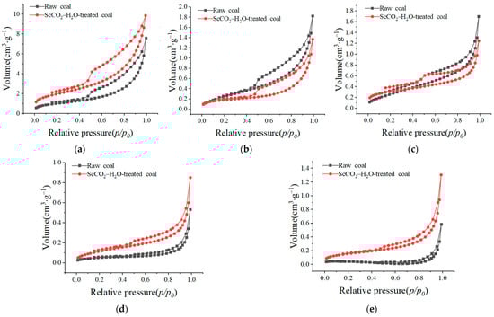 Based on the adsorption/desorption and coalescence theory, it was established that the distinct relative pressure disparities governing coalescence and evaporation processes delineate separate adsorption and desorption curves, thereby giving rise to a characteristic hysteresis loop. The shape of this loop, as well as the type of adsorption or desorption curves, provides insight into the pore morphology of coal [40]. Figure 5 shows the liquid nitrogen adsorption/desorption isotherms of the different coal samples. It can be seen that the hysteresis loops of the liquid nitrogen adsorption/desorption curves before and after the SccCO2–H2O treatment can be categorized into two patterns. The first hysteresis loop is wider (Figure 5a–c), and the desorption curve exhibits an obvious inflection point (desorption curve above the curve and adsorption curve below) when the relative pressure is about 0.5. These types of curves indicate that the coal samples contained a certain number of poorly connected ink-bottle-shaped pores [28,29]. The second scenario entails a narrower hysteresis loop, where the curves exhibit a rapid ascent at higher relative pressures, with the adsorption curve closely aligning with the desorption curve (Figure 5d,e). Such a curve configuration signifies the presence of a greater number of open macropores within the coal matrix, indicating improved pore connectivity [28,29]. Notably, the morphological characteristics of the liquid nitrogen adsorption/desorption curves for the coal samples remained largely consistent before and after the ScCO2–H2O treatment, with a slight expansion in the hysteresis loop observed. This result suggests that the ScCO2–H2O treatment did not significantly alter the overall pore morphology or pore connectivity.