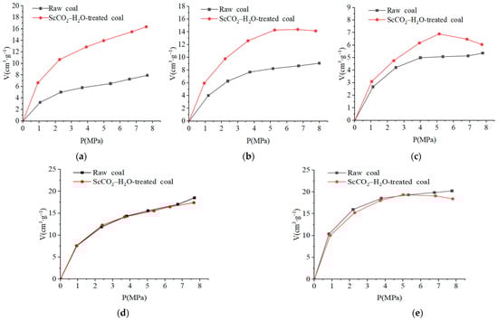 Isothermal adsorption curves of different coal samples: (a) MEG coal; (b) WT coal; (c) DJZ coal; (d) MZQ coal; (e) LY coal.