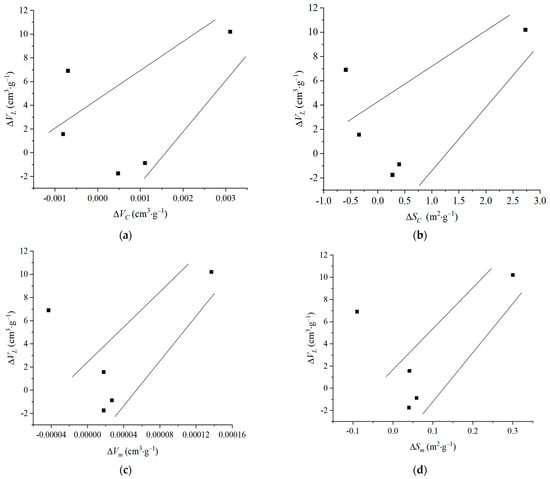 Relationship between pore structure and ∆VL: (a) relationship between ∆VC and ∆VL; (b) relationship between ∆SC and ∆VL; (c) relationship between ∆Vm and ∆VL; (d) relationship between ∆Sm and ∆VL.