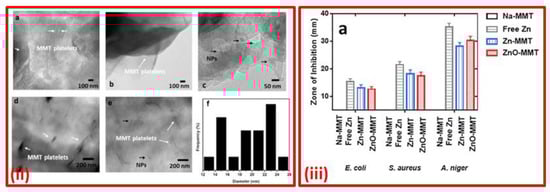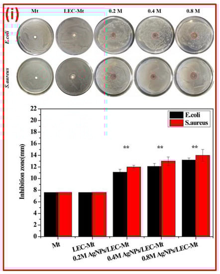 | AgNPs–montmorillonite | AgNPs–montmorillonite materials were synthesized by the chemical reducing method using NaBH4 in the external and interlamellar spacing of montmorillonite at room temperature. | Disc diffusion method using Mueller–Hinton agar | E. coli (ATCC 25922) | 6.0 mm | 8.74 ± 0.23 mm | The silver nanoparticles with a smaller size were found to have significantly higher antibacterial activity, which can be used as effective growth inhibitors in different biological systems, making them applicable to medical applications. | [39] |