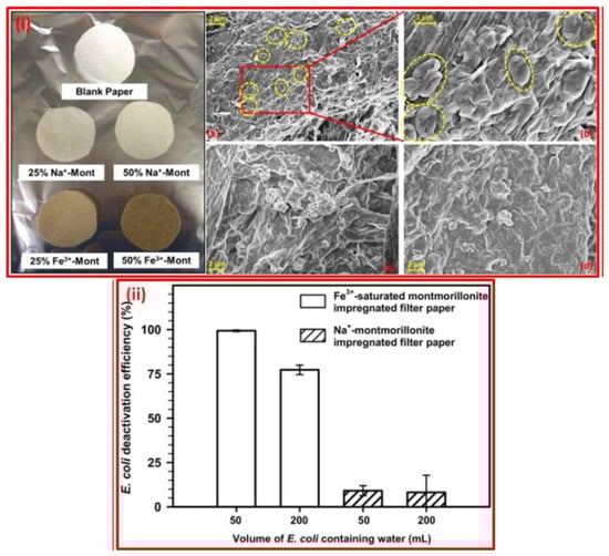 - Qin, C.; Li, L.; Kikkeri, K.; Agah, M.; Xia, K. Deactivation of E. coli in water using Fe3+-saturated montmorillonite impregnated filter paper. Sci. Total. Environ. 2019, 652, 643–650. [Google Scholar] [CrossRef] [PubMed]