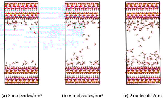 By comparing the adsorption of CH4 and C2H6 by kaolinite slits with different water content (Figure 2), it is found that, due to the presence of water molecules, the adsorption amounts of CH4 and C2H6 are greatly reduced, and the more water molecules there are, the less gas molecules are adsorbed in the kaolinite. The analysis shows that the presence of water molecules is not conducive to the adsorption of CH4 and C2H6. Due to the strong hydrophilicity of the mineral surface, water molecules are preferentially adsorbed on the pore surface of kaolinite to form water molecular layers [40]. With the increase in water content, two or three layers of water molecular layers can be formed, and these water molecular layers occupy the low-energy adsorption sites on the surface of kaolinite. The adsorption sites provided by kaolinite for CH4 and C2H6 are reduced.