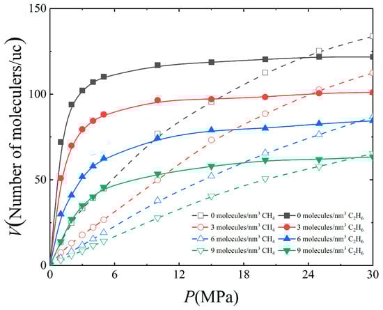 Figure 2 shows the change in adsorption capacity of CH4 and C2H6 on 3 nm kaolinite slit of 0, 3, 6, 9 molecules/nm3 with pressure when the temperature is 340 K. It was found that under all water contents, the adsorption capacities of CH4 and C2H6 initially increased rapidly and then tended to be stable with the increase in pressure. This trend is similar to the adsorption isotherms of the two gases in the pores of other clays [32,33,34,35]. According to the classification of isothermal adsorption lines by the International Union of Pure and Applied Chemistry (IUPAC) [36], these features are consistent with the adsorption behavior described by Type I (Langmuir). The Langmuir equation is expressed as follows: