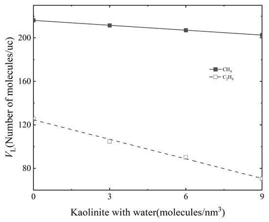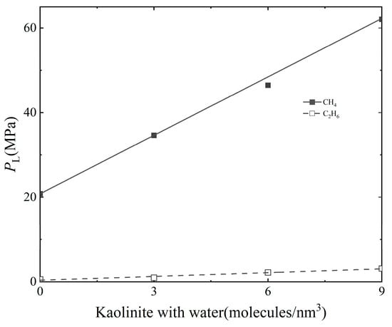 As can be seen from Figure 3, the Langmuir volume of both gases decreases linearly with the increase in water content. The relationship between Langmuir volume and water content of CH4 and C2H6 is VL = −1.496wt% + 216.110 and VL = −5.990wt% + 124.680, respectively. The slope of CH4 is −1.4976, which is lower than that of C2H6, which is −5.99, indicating that the addition of water molecules inhibits the adsorption of the two gases in the kaolinite slit, and the adsorption of C2H6 was increasingly inhibited more obviously. It can be seen from Figure 4 that the Langmuir pressure of CH4 and C2H6 increases linearly with the increase in water content. The relationship between Langmuir pressure and water content of CH4 and C2H6 is PL = 0.227wt% + 20.829 and PL = 0.029wt% + 1.890, respectively. This indicates that the pressure required for CH4 and C2H6 to reach the maximum adsorption capacity increases with the increase in water content in the slit, so it is difficult to reach adsorption saturation. Comparing the two curves, it is found that under all water contents, the Langmuir pressure of CH4 is higher than that of C2H6. Therefore, it can be seen that C2H6 more easily reaches adsorption saturation under a certain water content, which is consistent with the above analysis of adsorption isotherm.