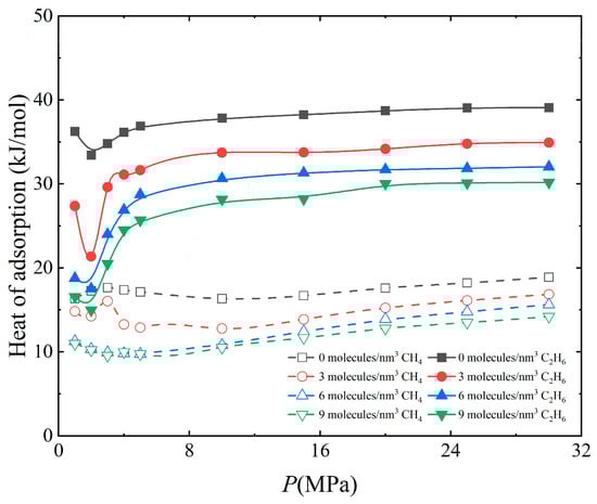 Figure 5 shows the change in isosteric adsorption heat of CH4 and C2H6 in 3 nm kaolinite slits with water contents of 0, 3, 6, 9 molecules/nm3 under pressure when the temperature is 340 K. It was found that the isosteric adsorption heat of CH4 and C2H6 under all water contents simulated is less than 42 kJ/mol. This indicates that the adsorption of the two gases by kaolinite with different water contents is physical adsorption, and we found that the isosteric adsorption heat of the two gases shows an overall increasing trend with increasing pressure at all water contents, suggesting that the interaction of the gases with the wall of the slit is stronger at high pressures [42]. Among them, the isosteric adsorption heat of CH4 on the surface of kaolinite ranges from 9.559–18.894 kJ/mol, which is similar to the isosteric adsorption heat of mud shale from 11.67 to 16.62 kJ/mol obtained by Yang et al. [43].