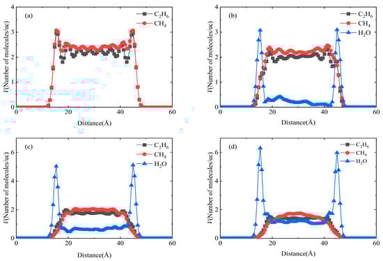 Figure 6 shows the distribution of CH4 and C2H6 along the direction (001) in a 3 nm kaolinite slit with a water content of 0, 3, 6, 9 molecules/nm3 under a pressure of 30 MPa. On the whole, the distribution of gas molecules and water molecules on both sides of the slit center is symmetrical, mainly because the structure of the kaolinite slit is similar in the upper and lower layers, and there are similar adsorption potential energies on both sides of the slit wall [44]. When there are no water molecules in the slit, CH4 and C2H6 form a main adsorption peak with high peak value near the surface of the slit due to strong interaction with the wall. At the distance of 20 Å from the slit wall, the interaction between gas molecules and the wall is weakened and a secondary adsorption peak with lower peak value is formed. As the distance from the wall increases, within the truncation radius, C2H6 still forms clear upper and lower symmetric adsorption peaks due to the strong interaction with the wall, whereas the interaction of CH4 with the wall is greatly reduced and its distribution becomes uniform.