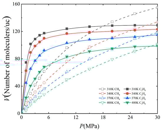 In order to explore the influence of temperature on the adsorption capacity of CH4 and C2H6, the adsorption isotherms of CH4 and C2H6 on the 3 nm kaolinite slit surface without water at 310 K, 340 K, 370 K and 400 K were calculated, respectively (Figure 7). The characteristics of the adsorption capacity of the two gases on the surface of kaolinite with pressure is also in accord with the Langmuir. The Langmuir constants of CH4 and C2H6 at different temperatures are shown in Table 3. The correlation coefficients of the two gases are both greater than 0.96, and the fitting results are reliable. As can be seen from Figure 7, with the increase in temperature, the adsorption capacity of CH4 and C2H6 decreases, which is consistent with the conclusion obtained by Li et al. [45]. The main reason for this phenomenon is that the adsorption behavior of kaolinite to CH4 and C2H6 is an exothermic process, and the increase in temperature leads to the intense movement of CH4 and C2H6 molecules and an increase in kinetic energy [9,44]. This plays an active role in the desorption of gas molecules, thus reducing the adsorption amount of CH4 and C2H6. The pressures of the two gases with the same adsorption capacity at 310 K, 340 K, 370 K and 400 K are 17.98 MPa, 24.41 MPa, 28.47 MPa and 29.42 MPa, respectively, indicating that the desorption point moves to a higher value with the increase in temperature. This phenomenon has also been reported in montmorillonite, illite and kerogen [34,35,46].