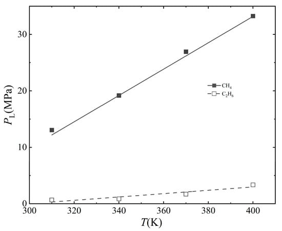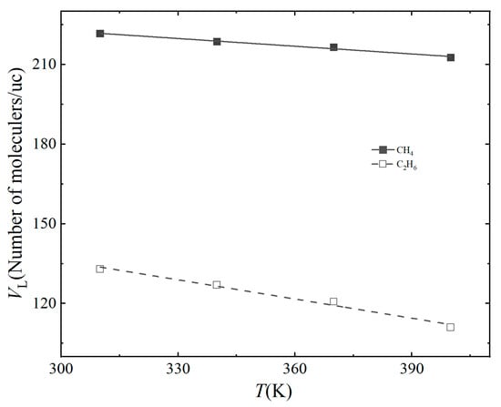 Figure 8 and Figure 9 show the variation rules of Langmuir volume and Langmuir pressure of the two gases with temperature, respectively. The Langmuir volume of the two gases decreases linearly with the increase in temperature. The relationship between Langmuir volume and temperature of CH4 and C2H6 is VL = −0.097T + 251.760 and VL = −0.24T + 208.182, respectively. The slope of curves of CH4 is −0.097 and that of curves of C2H6 is −0.24, which is similar to the above effect of water content on adsorption. The increase in temperature is also unfavorable for the adsorption of the two gases in the kaolinite slit, and the inhibition of the adsorption of C2H6 is more obvious. The Langmuir pressure of CH4 and C2H6 increases linearly with the increase in temperature. The relationship between Langmuir pressure and temperature of CH4 and C2H6 is PL = 0.233T − 60.190 and PL = 0.029T − 8.891, respectively. This indicates that the increase in temperature also leads to the increase in the pressure required for CH4 and C2H6 to reach the maximum adsorption capacity, making it more difficult to reach the state of adsorption saturation. This is because as the temperature increases, the mean free path of gas molecules increases, and the probability of collision with the slit wall decreases during the movement, which is not conducive to the adsorption [47]. By comparing the two curves, it is found that the Langmuir pressure of CH4 is higher than that of C2H6 at all temperatures. It can be seen that C2H6 is more likely to reach adsorption saturation at a certain temperature.
