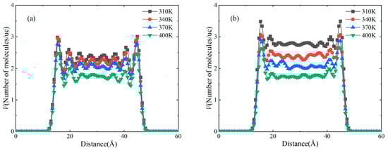 In order to specifically describe the distribution states of CH4 and C2H6 in the kaolinite slit at different temperatures, we calculated the distribution maps of CH4 and C2H6 in the 3 nm kaolinite slit along the direction (001) at 310 K, 340 K, 370 K and 400 K, respectively (Figure 11). It is found that CH4 and C2H6 also exhibit distribution characteristics similar to that shown in Figure 6a at all temperatures. In addition, the number of gas molecules on the slit surface and in the central region decreases with the increase in temperature, but the change in temperature does not cause the change in adsorption peak location. Moreover, the main adsorption peak of CH4 is about 16 Å from the wall, and the secondary adsorption peak is about 20 Å from the wall, the position of C2H6 main and secondary adsorption peaks is also the same, which indicates that the two gases can coexist near the surface of kaolinite. A similar phenomenon also appears in the adsorption process of CH4 and C2H6 by calcite [48]. The thickness of the first adsorption peak of CH4 and C2H6 is 0.375 nm and 0.39 nm, respectively, which are the kinetic diameters of the two gases. As the temperature increases from 310 K to 400 K, the adsorption peak formed by C2H6 in the center of the slit gradually disappears, this is because the gas molecules move rapidly and the kinetic energy increases, overcoming the interaction with the slit wall and forming a free state.