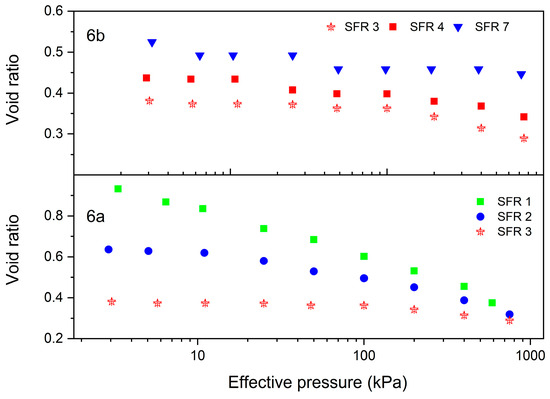 Figure 6 shows that the saturated void ratio of the samples decreased from SFR 1 to SFR 7. The samples as prepared (at the start of the compression test) had lower void ratios with increases in SFR. Fines and, particularly, clay minerals have very large specific surface areas and are known for their high degree of affinity for water. The decrease in void ratio with SFR can be attributed in part to the decrease in the samples’ fines content. The porosity along sand particles is higher than that within the assembly of fine particles. The other possibility in which fines would affect the unit weight of the samples is that of the fines occupying the pores between the sand particles, lowering the void ratios of samples as presented using the compression measurements (please see Figure 6). Both kc (Figure 5) and void ratio (Figure 6) indicate that for SFR > 3, both kc and void-ratio properties were simply dominated by the coarse particles. The small gradient of void ratio with effective pressure lines also meant that beyond SFR 3, the pressure was carried mainly by the skeleton of coarse particles which were in contact with each other and showed very minimal compression other than rearrangement. The optimal mix ratio of FFT based on unit weight gain and hydraulic conductivity improvement could be deduced to be SFR 3. Practically, the optimum SFR should be concluded after also considering the shear strength for load-bearing capacity.