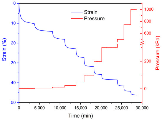 The sample stainless-steel cell used was 100 mm in diameter and the initial sample thicknesses were always >25 mm. Deionized water (DI) was added in the sample carriage to keep samples fully saturated throughout the test periods. Periodically, DI was squirted to cover the edges of the loading pad to ensure the top porous stone was capped with water too.