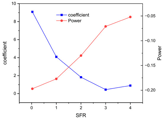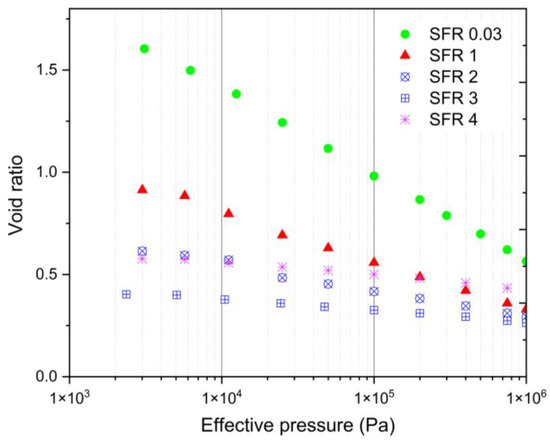 The relationships between void ratio and effective stress for highly compressible materials and soils are often expressed by a power function [31,32] as given in Equation (3). The coefficient and power law constants of the empirical curve fit for the varying SFR are plotted in Figure 9. The Figure shows the inverse relationship between compression rate and absolute compression with SFR. Table 3 gives the e–σ′ power fit relation with a best least-squares fit correlation factor > 0.94 for all.