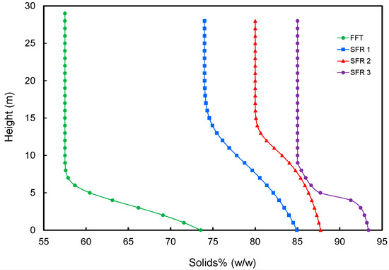 Finite-strain model solids profile output of thickened FFT at varying SFR after 25 years of consolidation.