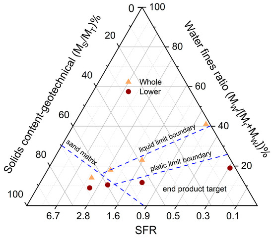 Ternary diagram depicting the consolidated samples region relative to the boundary lines. Mf, MT, and MW represent the masses of fine solids, whole tailings and water mass, respectively. Solid contents of the whole deep-pit and those below the inflection of the solids profile (Figure 10) are plotted.