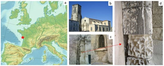 The Saint Sauveur Church is situated in the picturesque coastal town of La Rochelle, on the Atlantic coast of France (Figure 1a,b). This notable edifice holds a prominent position near the bustling port and the city center, making it vulnerable to both marine aerosols and traffic pollution. Its initial construction dates to 1152, but unfortunately, it has endured two devastating fires and witnessed the ravages of human conflicts, resulting in four reconstructions, the most recent one being in 1720. In the late 19th century, a significant restoration effort was undertaken, followed by another restoration in 2007 due to the deteriorated state of the structure (Figure 1c,d). The church is predominantly built from Crazannes limestone, a microsparitic stone with a light hue and approximately 25% porosity, originating from the Upper Turonian geological period.