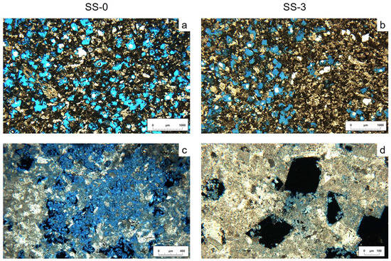 The blue resin allowed image analysis for porosity identification and quantification. White spots corresponded to closed porosity and bubbles from trapped resin. In a general view, there is already a remarkable difference between the two samples, with more blue areas and homogeneous repartition in the surface sample SS-0 than in the SS-3, with cemented areas (Figure 3a,b). In SS-0, an open porosity of 20% ± 0.5% was detected on the image (accessible to the blue resin), while we measured a closed porosity of only 0.2% ± 0.02%. In SS-3, the area of blue resin is visually smaller, with a result from the image analysis quantification of 17% ± 0.5%. In this case, the closed porosity is higher, with a 4.5% ± 0.2%. Thus, image analysis gives similar values for both samples, with around 20%–22% of total porosity.