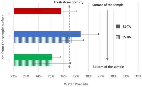 Mean and standard deviation of porosity obtained by water absorption. Dark colors correspond to top alveoli samples, and lighter colors to the bottom alveoli samples. The dotted line represents the porosity of the fresh stones. Six samples were used for all the tests except for SS-BA-3, for which only four samples could be prepared.