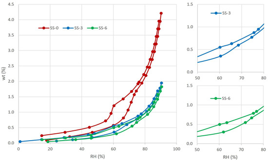 The sorption–desorption isotherms obtained clearly demonstrate a distinction between the surface sample and the two samples taken from different depths (Figure 5). The internal samples, SS-3 and SS-6, exhibit lower water vapor adsorption, with values around 2 wt% at 95% RH, whereas the surface sample, SS-0, reaches over 4 wt% at 95% RH. The hysteresis observed in the three isotherms during desorption is generally assumed to be produced by an ‘ink-bottle-effect’, where moisture gets trapped inside large pores surrounded by smaller pores. This hysteresis is remarkable for the surface sample.