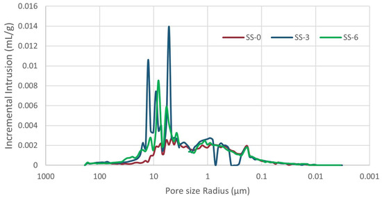 Regarding the pore size distribution (Figure 6), it can be observed that the depth samples showed peaks of porosity in the larger pores over 5 µm, which are absent in the surface sample. Calculations provide that the SS-0 sample has a porosity over 5 µm slightly exceeding 25%, whereas the interior samples demonstrate values closer to 50% of the measured porosity (Table 2).