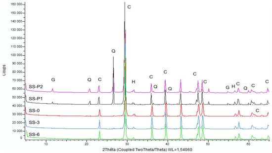 The diffraction patterns of the five samples, three prepared from the solid slice and two from the powder, are presented in Figure 7. Differences can be observed between the samples prepared from the rock (SS-0, SS-3 and SS-6) and the weathering products (SS-P1, SS-P2). All the samples showed a predominantly calcitic composition, with a small amount of halite present. Peaks appearing around 31–32° and 57° can indeed be attributed to halite, although variations in intensity and additional smaller peaks could correspond to gypsum or calcite. The powder recovered from the alveoli showed quartz and gypsum, with characteristic and distinct peaks for each mineral. The mineralogy of the powder samples (SS-P1, SS-P2) is comparable, and in both cases, the calcite peaks exhibit a slight shift toward the left in comparison to the samples from the stone. According to the database, these peaks fit well with calcite compositions containing around 3%–4% magnesium.