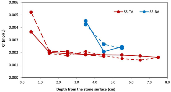 The evolution of chloride concentration inside the stone was also determined using the method known as chloride titration. Precisely weighed 5 g of stone powder was placed in a beaker and then 50 milliliters of distilled water added. This first solution was stirred for 2 min using a magnetic stirrer. Then, 100 mL of a solution containing 80% distilled water and 20% nitric acid HNO3 was also added to the initial solution. This second solution was heated slowly while using the magnetic stirrer again for 30 min, and posteriorly cooled down freely for 5 min. This solution was filtered using a funnel containing a filter paper and transferred into a 250 mL volumetric flask. The filter was rinsed with deionized water, and this water was also added to the already filtered solution up to the 250 mL mark. The determination of chloride (Cl−) concentrations using the titration station was completed by combining potentiometric titration and volumetric Karl Fischer titration, utilizing the full functionalities of both titrators on a single analysis station. The results were obtained in terms of the mass fraction of CaCO3 in the stone. Samples every 1 cm in depth were prepared and measured in 2007, from TA and BA zones. Depending on the material, for TA zones, there are up to seven samples while for BA zones up to three.