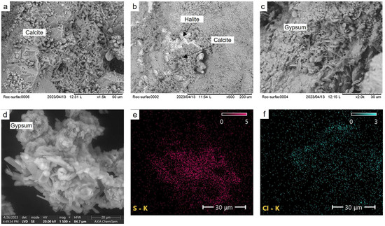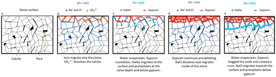 When salts crystallize in a polluted area, even close to the sea, there is a higher proportion of SO2 and NOx compounds compared to NaCl. The nature and concentration of pollutants are influenced by the proximity to rural or urban areas. Nitrates from pesticides in rural regions [19,36] and sulfates/nitrates from urban areas, resulting from vehicles, heating systems, and industrial activities, primarily react with limestones through dry or wet deposition [37,38]. Dry deposition involves the dissolution of carbonate stones or minerals and the precipitation of sulfates such as gypsum and nitrates [39,40,41]. If organic matter is present in the atmosphere, these particles become trapped within the gypsum crystals, leading to unsightly patinas and black crusts [27,32,37,42,43,44,45]. Wet deposition, on the other hand, occurs when acid rain interacts with the stone surface, causing leaching and mineral dissolution [40,41,46].