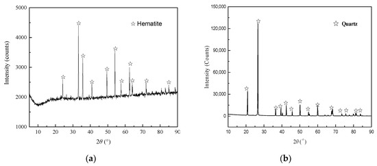 High purity hematite and quartz samples were obtained from Havre Saint-Pierre iron ore mine in eastern Canada and US SILICA company, respectively. The results of X-ray powder diffraction (XRD) pattern inspection (Figure 1) and X-ray fluorescence chemical (XRF) analysis (Table 1) were determined using Ultima IV and S8 TIGER devices (Laboratory of Chemistry and Materials Engineering, Shenyang Ligong University, China), respectively. The purities of the hematite and quartz samples were 97.12% and 98.51%, respectively.