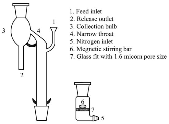 Micro-flotation tests for the single or synthetic mixed minerals (the mass ratio of hematite and quartz was 1:1) were carried out in a custom-made glass flotation tube modified according to the recommendations of Siwek, shown schematically in Figure 2 [17]. For each test, 2 g of sample was added to the sintered glass container installed at the bottom of the tube with a diameter of 1.6 µm. Subsequently, add 180 mL of water with a pH value of 5.0 from the inlet and agitated at 2000 rpm for 2 min. After stirring this pulp, the collector CTAC was added to the flotation tube after water dissolution. This was followed by 5 min of stirring and a subsequent injection 5.33 kPa of gas from the nitrogen inlet of the flotation tube. Finally, 5-min flotation was performed, and the concentrate was scraped, dried, and weighed, and the chemical compositions (Fe and SiO2) were determined via the S8 TIGER device.