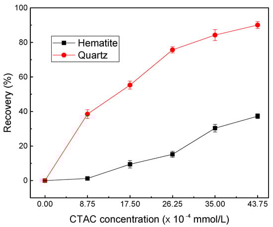 Numerous studies have shown that the zero electrical points of hematite and quartz were around pH 2.2 and 4.9, respectively [1,9,15]. Therefore, in order to ensure a significant difference in surface electrical properties between hematite and quartz, micro-flotation was carried out under the natural suspension pH, which was set to approximately 5.0. In order to observe the floatability of both minerals by CTAC, flotation recovery was examined as a function of CTAC concentration as shown in Figure 3.