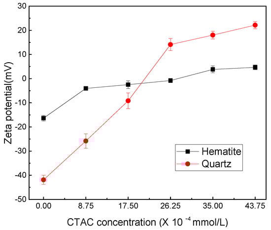 CTAC dissociates in water and exists in the form of positively charged C19H42N+, the adsorption of which onto a mineral surface can change the electrical properties of the mineral/liquid interface. Here, the adsorption capacity of CTAC on the surface of hematite and quartz was analyzed by measuring surface potential changes of minerals before and after the interaction with CTAC. The zeta-potential measurements results are presented in Figure 4.