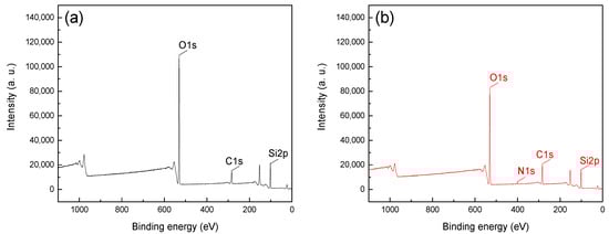 In order to further reveal the adsorption difference and mechanism of CTAC on the mineral surface, the XPS analysis was detected with a CTAC concentration of 26.25 × 10−4 mmol/L at pH 5. The XPS spectra of hematite and quartz before and after treatment with CTAC are shown in Figure 5 and Figure 6, respectively.