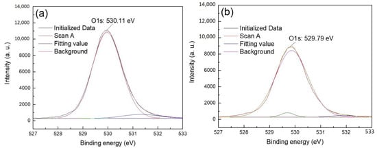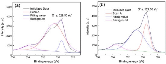 As an amine cationic collector, CTAC was mainly adsorbed onto the mineral surface via electrostatic adsorption [15,16]. In order to obtain the difference in the adsorption strength of CTAC on the surface of hematite and quartz, the anions (i.e., O1s) on the surface of the two minerals were fitted and analyzed before and after treatment with CTAC, and the results are shown in Figure 7 and Figure 8.