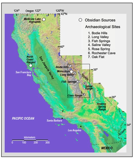 Obsidian is found extensively across California, with more than 50 different sources documented in the US Obsidian Source Catalog of the Northwest Research Obsidian Studies Laboratory []. Many of these occurrences were exploited for tools by prehistoric populations. Archaeological evidence suggests that the conveyance of obsidian occurred over great distances within the California Culture Area [,,,] and that separate trading obsidian networks amongst prehistoric people in northern and south-central California [,]. It is generally considered that obsidian acquisition/use patterns in California shifted over time [,] in response to both geological and climatic factors [] and persisted into the colonial period. For example, Native American people living at Mission San José (ca. CE 1797–1840) acquired obsidian using long-distance conveyance, i.e., geographic displacement from its place of origin, from distant source areas as well as through recycling of archaeological artifacts [].
