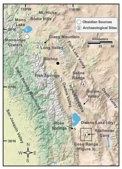 Archaeological studies within the Great Basin region have determined that eight predominant obsidian sources between the Bodie Hills and Death Valley were exploited by prehistoric populations (Figure 1 and Figure 2); Mt. Hicks and Truman/Queen in westernmost Nevada and Bodie Hills; Mono/Inyo Craters, Glass Mountain, and Casa Diablo in the Long Valley area; and Fish Springs, the Saline Range, and the Coso Range in eastern California [,,,,,,,,]. A pattern of obsidian source utilization and conveyance has been recognized, with primary trade west across the Sierra Nevada from sources latitudinally parallel to the Owens Valley. The Bodie Hills source dominates archaeological assemblages in the northern area [], with obsidian from the Casa Diablo site in Long Valley predominant in the southern area [,], although a variety of other sources are represented [,]. Within archaeological contexts in the southern San Joaquin Valley and throughout southern California, obsidian derived from the Coso Range is most abundant [,,,,,].