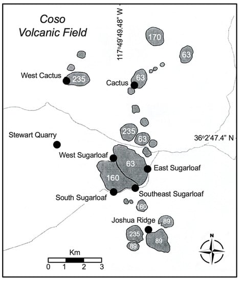The two oldest domes, with ages of 1040 Ka and 587 Ka, not shown in Figure 3, are small outcrops in the far northeast and central areas of the CVF that are much more extensively eroded than other CVF rhyolites. At least eight individual rhyolite bodies of intermediate size are scattered across the north-central portion of the CVF and comprise the 235 Ka suite. The three members of the 170 Ka group are small rhyolite bodies, one located in the far north and the other two present in the far south of the CVF. Bacon et al. [] point out that one group of very geochemically similar rhyolites, consisting of four domes including South Sugarloaf Mountain and one extensive lava flow in the center of the CVF could not be dated by the K-Ar method with an acceptable precision. An age of 160 Ka was assigned to this rhyolite suite based on the obsidian hydration rind thickness and because geological field evidence suggests that these outcrops were closer in age to the 170 Ka suite than to the younger rhyolite group erupted at 89 Ka. Three large domes in the Joshua Ridge area in the southern portion of the CVF comprise the 89 Ka group. The 15 youngest domes and flows comprise an arcuate pattern from north to south in the middle zone of the CVF and were formed at 63 Ka. Included in this group are the large domes of Cactus Peak and Sugarloaf Mountain (termed East Sugarloaf Mountain in Figure 3) that were emplaced through the older South Sugarloaf Mountain dome.