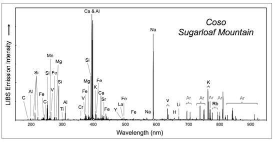 Representative LIBS broadband spectra between 150–950 nm for the obsidian analyzed in this study. This sample from Sugarloaf Mountain in the Coso Volcanic Field has a composition similar to the specimen in Table 1, analyzed by Bacon et al. [], namely 35% Si, 6.5% Al, 3%–4% Na and K, 0.5 to 0.7% Fe and Ca, and ~300 ppm Mg and Rb. The Ar peaks in the infrared portion of the spectrum between 700 and 920 nm (shown in grey text) are from the Ar purge gas used via the handheld analyzer for the LIBS analysis.