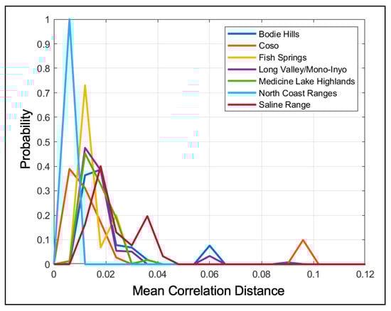 Plot showing the probability density functions (PDFs) of the median correlation distances for each of the seven obsidian sources as a measure of the intra-sample variability of the LIBS spectra.