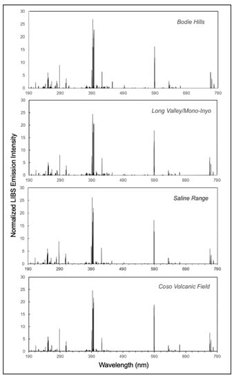 Geochemical analysis of obsidian can provide insights into artifact production and past trade patterns [,,]. Handheld laser-induced breakdown spectroscopy (LIBS) has emerged as a practical technology for in situ geochemical analysis because it is capable of rapid and minimally destructive determination of the elemental composition of geological and archeological materials in the field under ambient environmental conditions. Since LIBS is simultaneously sensitive to all elements, and particularly sensitive to light elements which are difficult to determine using other methods (e.g., H, Li, Be, B, and C), a single laser shot may be used to measure the spectral intensity of specific elements for quantitative analysis or record the broadband LIBS emission spectrum that is a unique compositional signature, i.e., a geochemical fingerprint. Studies on the analysis of geological materials such as marble [], flint [], pozzolan [], glass [,,,], and particularly obsidian [,,,] demonstrate that distinguishing compositional characteristics can be recognized via LIBS analysis. The objective of this study is to use multivariate chemometric analysis of LIBS broadband spectra to determine obsidian artifact provenance via comparison with a spectral library for samples of known origin, with a focus on the specific application of handheld LIBS to discriminating of obsidian sources and determining the provenance of obsidian artifact sites in California.