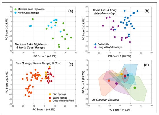 As noted in Table 1 and discussed in Section 2.2 above, high-silica rhyolite obsidian has a broadly similar chemical composition wherever it is erupted. Thus, the average broadband LIBS spectra for our seven California obsidian sources are likewise broadly similar. Though there are small differences between spectra, it is difficult to distinguish the four spectra without careful visual inspection (Figure 6). Chemometric analysis of our LIBS spectral data is, therefore, ideally suited to address the challenge of obsidian source discrimination and artifact provenance determination.