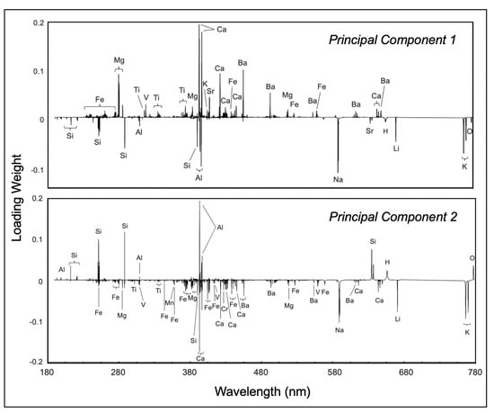 The 3D translational stage that permits rastering the laser beam across the surface of a sample is computer-controlled for automatic adjustment of the laser focus at each sample location. Automated stage movement permits analysis over a 2 × 2 cm area, with the raster pattern, spacing, and number of laser shots at each location determined by the user. For this study, four laser shots for data collection were taken at each point on five different 4 × 3 point grids covering an area of approximately 1.0 × 0.7 mm, following two laser shots for sample surface cleaning. The 48 accumulated individual analyses were averaged to produce a composite LIBS spectrum, such as that shown in Figure 4, with five such average spectra acquired from fresh obsidian flakes for each sample. These broadband LIBS emission spectra provide a spectral geochemical fingerprint that includes all elements present in the sample above their intrinsic limits of detection by LIBS.